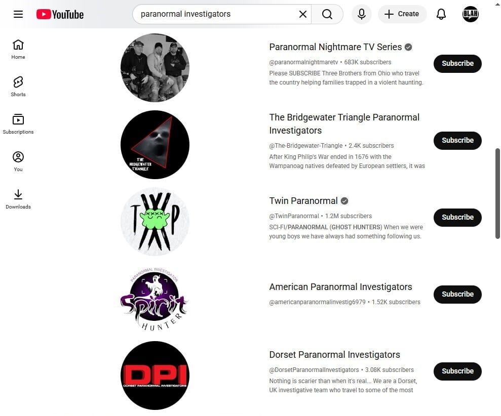 YouTube Search for Paranormal Channels